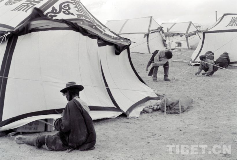 圖為在文部辦事處(現(xiàn)改為尼瑪縣)的布藏河畔舉行賽馬會(huì)前,城鎮(zhèn)人家正在搭建各自的帳篷(唐召明1987年攝)