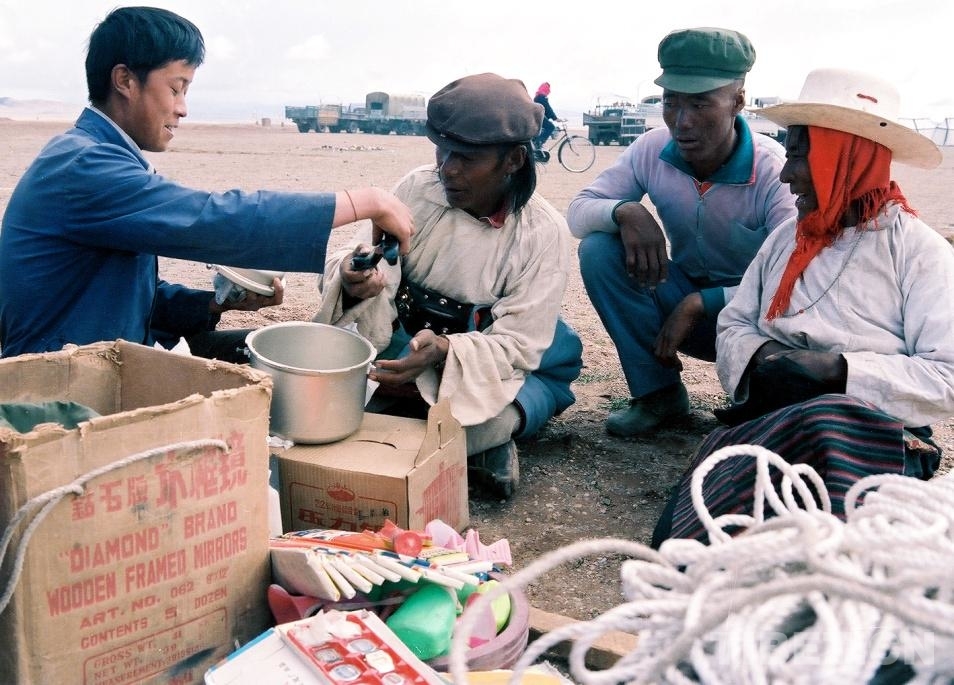 圖為在文部辦事處(現(xiàn)改為尼瑪縣)賽馬會(huì)上,如“候鳥(niǎo)”一樣飛來(lái)飛去的漢族商販在經(jīng)營(yíng)小商品(唐召明1987年攝)