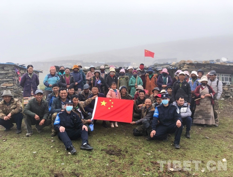圖為三安曲林邊境派出所民警和群眾與國(guó)旗合影