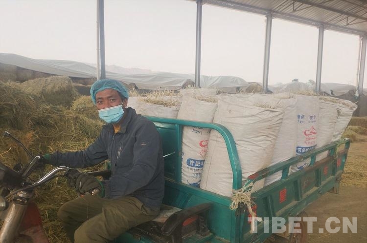 圖為崗尖村村民普布在養(yǎng)殖場運(yùn)送草料