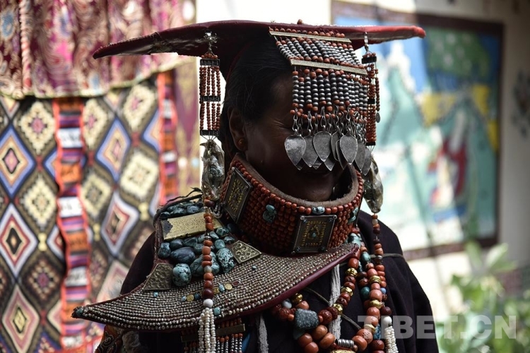 圖為阿里地區(qū)普蘭縣科迦村,一名婦女穿戴“孔雀服飾” 攝影:王媛媛