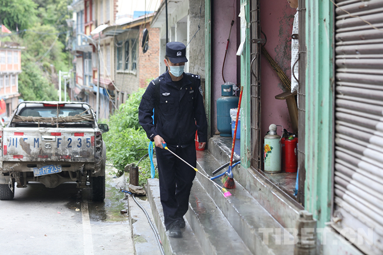圖為邊檢站民警為駐地工人生活區(qū)消毒 攝影:鄒興國(guó)
