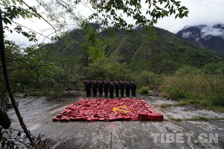 圖為聶拉木邊檢站民警搬運石頭堆砌黨旗 攝影:鄒興國