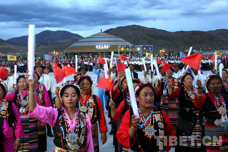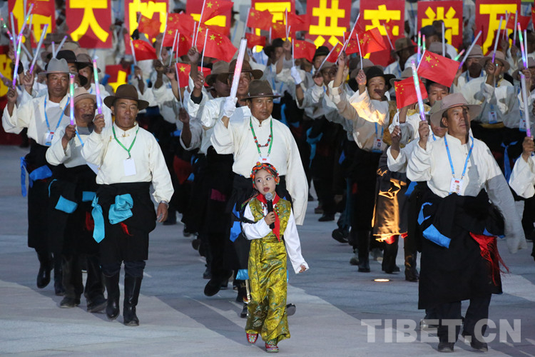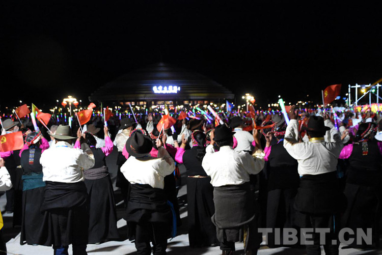 珠峰文創(chuàng)園區(qū)的聯(lián)歡活動(dòng)分為三個(gè)章節(jié),以《在燦爛的陽光下》《各族人民感恩黨》《西藏人民齊歡唱》三首歌曲作為開篇樂,來自日喀則各族各界的演員們,身著日喀則特色節(jié)日盛裝,在廣場中央,擺出數(shù)字“100”的造型,跳起歡快的鍋莊舞,在燈光的輝映下,造型美輪美奐。