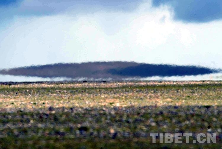 圖為出現(xiàn)在藏北無人區(qū)的形似飛碟的海市蜃樓。海市蜃樓是因空氣中不斷升騰的水汽將光線折射而形成(唐召明2009年8月2日攝)