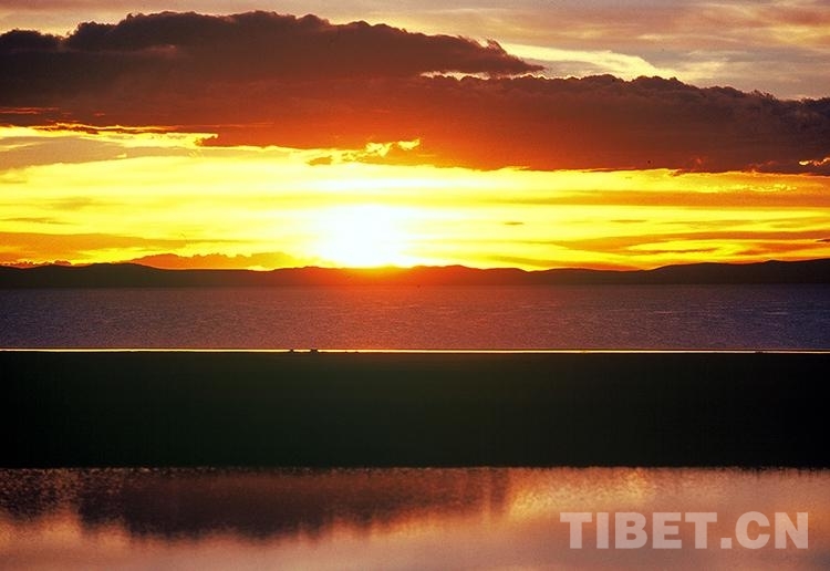 這是文部辦事處(現(xiàn)尼瑪縣)草原的一個黃昏。東部天際深灰色云層的背景上,陽光突破地平線上的一點,輻射出扇形的帶狀光芒。那光芒直射中天,何止萬丈之遙!突然發(fā)現(xiàn)這奇觀,我便歡呼起來,身邊的那些藏族朋友卻不以為然,因為他們見得多了。他們告訴我,在這束光芒之前,有方形光芒閃爍,在方形光芒之前,曾出現(xiàn)一道彩虹,都出現(xiàn)在天邊同一方位。
