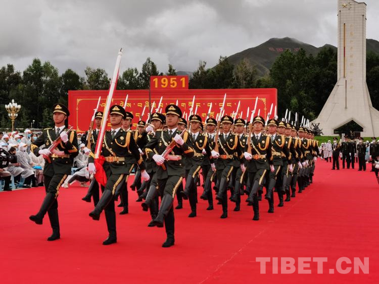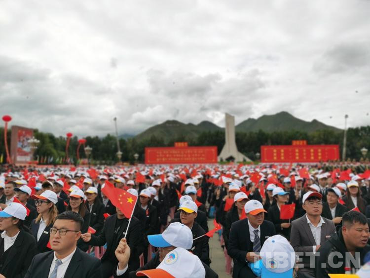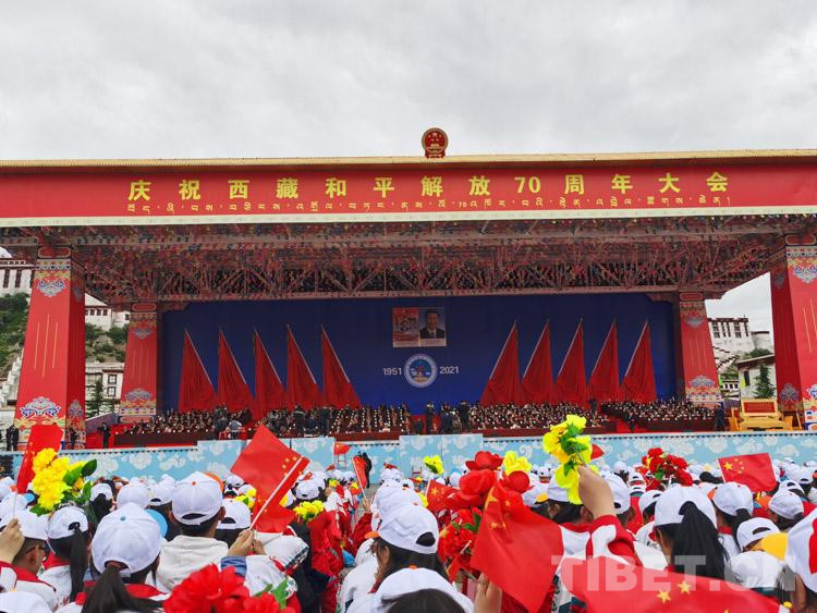 上午10時,齊扎拉宣布大會開始。全場起立,奏唱國歌,鮮艷的五星紅旗在布達(dá)拉宮廣場冉冉升起。在熱烈的掌聲中,尤權(quán)宣讀了中共中央、全國人大常委會、國務(wù)院、全國政協(xié)、中央軍委關(guān)于慶祝西藏和平解放70周年的賀電。