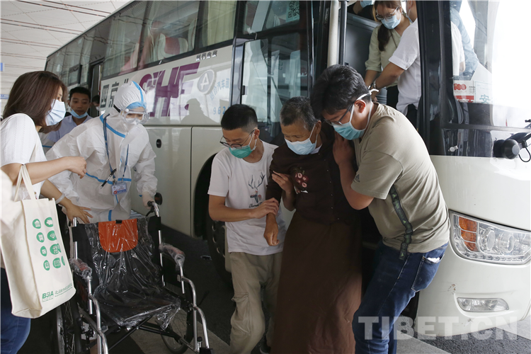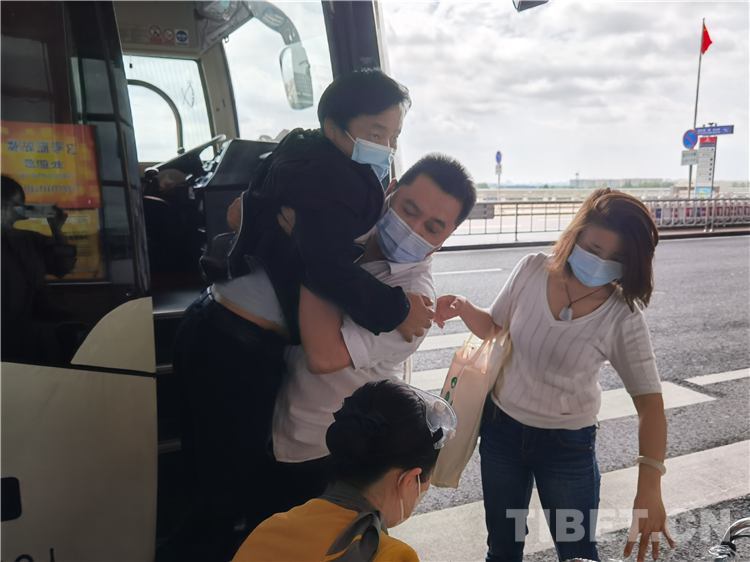 圖為中國(guó)社會(huì)科學(xué)院民族學(xué)與人類(lèi)學(xué)研究所的青年志愿者們用藏語(yǔ)和即將返鄉(xiāng)的患者話(huà)別