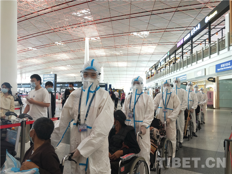 圖為首都機(jī)場(chǎng)工作人員周到有序的幫助患者推輪椅進(jìn)入候機(jī)廳