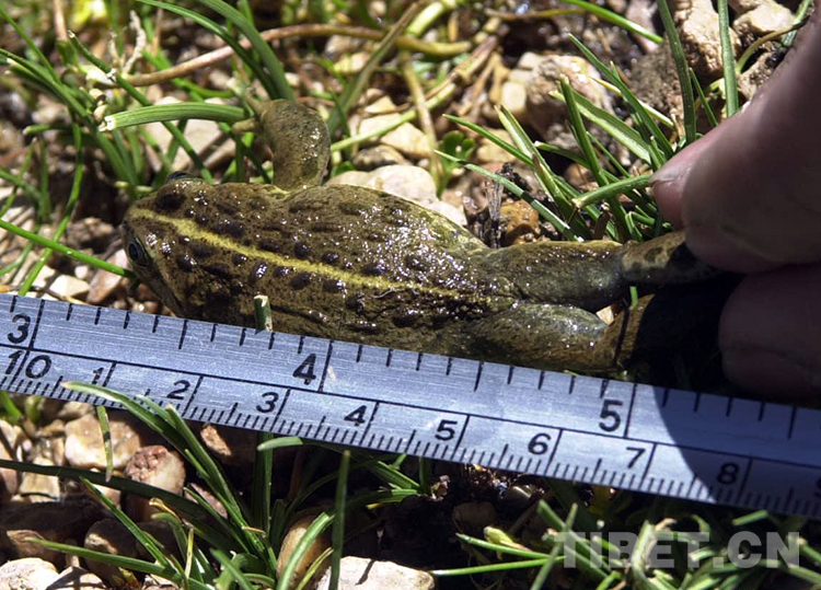這是藏北無(wú)人區(qū)科考團(tuán)科考人員在給申扎縣雄梅鄉(xiāng)所發(fā)現(xiàn)的高山蛙量體長(zhǎng)。這種高山蛙的新發(fā)現(xiàn),填補(bǔ)了我國(guó)高海拔地區(qū)沒有蛙類生存的空白(唐召明2001年攝)