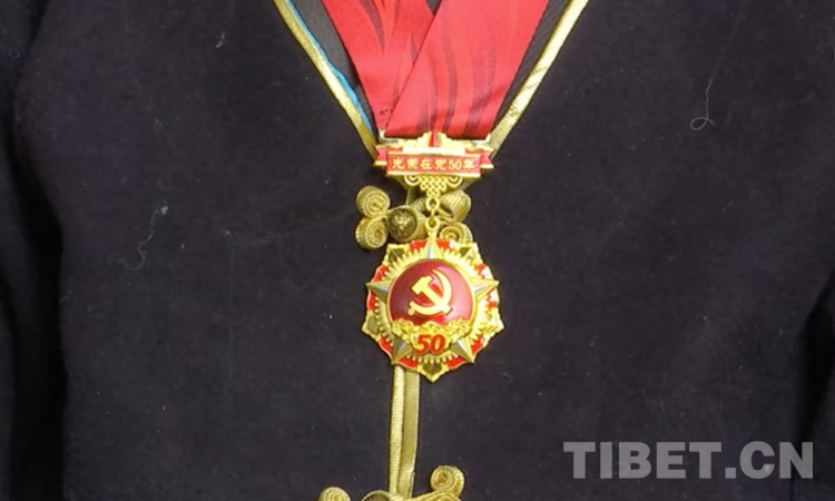 圖為洛桑曲珍老人胸前的光榮在黨50年紀念章 攝影:田江朋