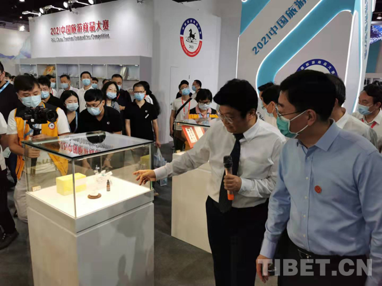 圖為國(guó)家文化和旅游部副部長(zhǎng)杜江(右)聽取中國(guó)旅游協(xié)會(huì)旅游商品與裝備分會(huì)秘書長(zhǎng)陳斌(左)介紹獲2021中國(guó)旅游商品大賽銀獎(jiǎng)的“西藏禮物”文創(chuàng)產(chǎn)品“瑪尼石香氛”。