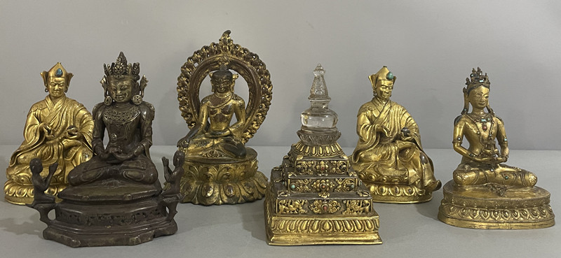 其中,5件金銅佛造像和1件銅鎏金水晶嵌寶石供養(yǎng)塔制作工藝精良,專家建議暫定為三級文物。特別是1尊明末清初的黃銅同侍從無量壽佛造像,呈現(xiàn)出顯著漢藏融合風(fēng)格,其六面形臺座多見于漢藏風(fēng)格唐卡與壁畫,在銅造像中較為罕見。