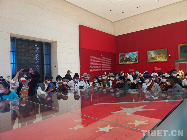 圖為西藏基層干部參觀開國(guó)大典上使用過的五星紅旗 攝影:王茜