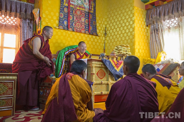 班禪講經(jīng)、禮佛后,在納塘寺主殿二樓一間經(jīng)堂內(nèi)特意現(xiàn)場抽查測試了年輕僧人對佛經(jīng)的背誦學習情況,聽取四批僧人背誦經(jīng)文,并隨機提問。聽到僧人們對答如流,班禪頻頻點頭、微笑肯定。