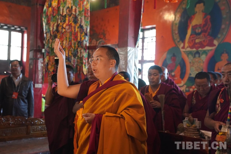 在每所寺院開展佛事活動時,班禪按宗教儀軌向僧眾發(fā)放布施、供齋茶、齋飯,同時關(guān)切詢問僧人的學經(jīng)、修行、生活等情況。班禪在講經(jīng)、闡釋教義的同時,多次勉勵僧眾要適應(yīng)人民群眾向往追求的方向,講好經(jīng),傳好法,做合格僧尼。言傳身教、以身作則,引導寺廟僧尼和信教群眾正信正行。