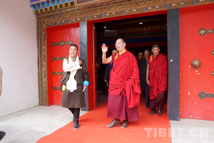 紀(jì)念館外,聞訊而來的信教群眾手捧哈達(dá),迎候班禪并恭?!霸鞯吕铡?。班禪在走進(jìn)紀(jì)念館前后,揮手向群眾回以祝福。
