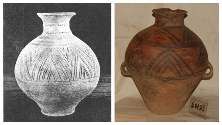 左圖為卡若遺址出土的陶罐 圖片翻拍自《昌都卡若》考古發(fā)掘報告;右圖為甘肅馬家窯文化三角折線紋彩陶壺 圖片來源于馬家窯文化官網(wǎng)