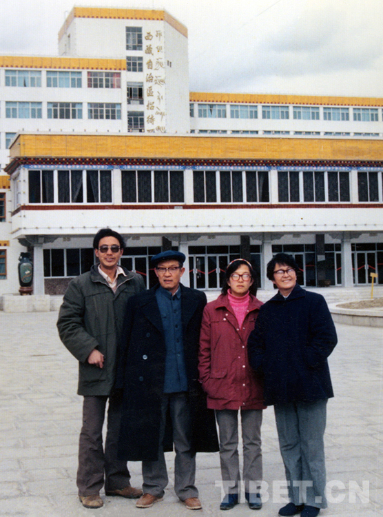 這是唐召明(左一)與孫光明(左二)一家在拉薩西藏自治區(qū)招待所樓前合影留念(旺堆1990年攝)