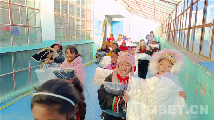 圖為古姆鄉(xiāng)小學(xué)小學(xué)生拿到捐贈(zèng)的羽絨服