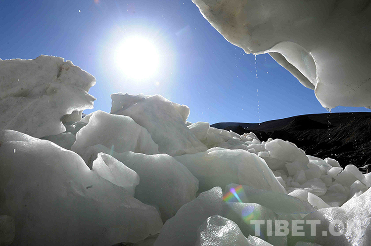 此外,被稱為除南極、北極以外的世界第三大冰川——普若崗日冰川的融水痕跡也很明顯,冰原外圍冰體常見(jiàn)掛滿融水的冰凌;常見(jiàn)正在融化、殘留地面的許多冰塊及那些從冰川下裸露出的大大小小的石頭。
