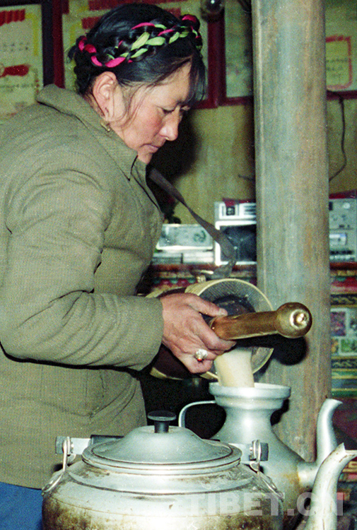 這是青藏公路安多養(yǎng)護(hù)段109道班女工,正在往酥油茶壺里倒剛打制好的酥油茶(唐召明1991年攝)