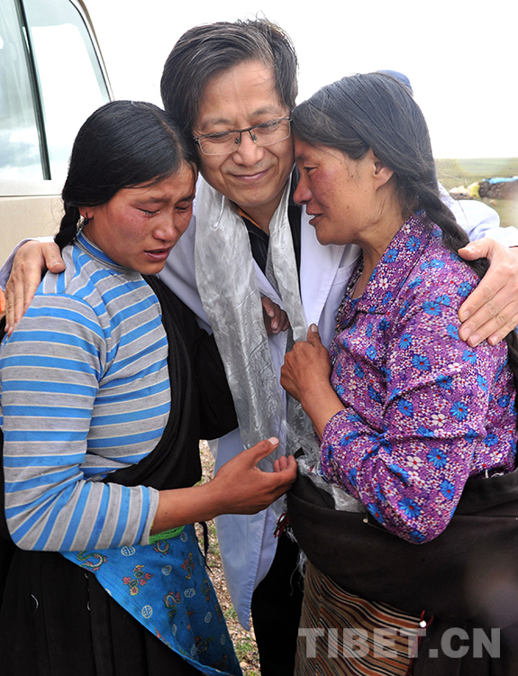 這是曾為斯求卓瑪進(jìn)行手術(shù)的北京口腔醫(yī)院口腔頜面外科主任韓正學(xué)來到西藏自治區(qū)那曲市班戈縣新吉鄉(xiāng),在為斯求卓瑪作術(shù)后檢查時(shí),卓瑪母女倆奔向韓正學(xué)懷抱相擁而泣(唐召明2015年7月14日攝)