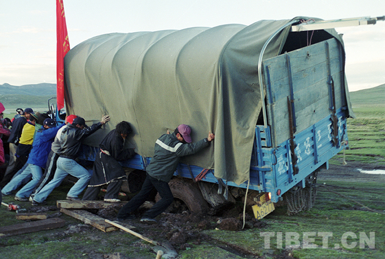 這是科考人員在奮力推出陷進藏北無人區(qū)沼澤地帶的科考卡車(唐召明2001年攝)
