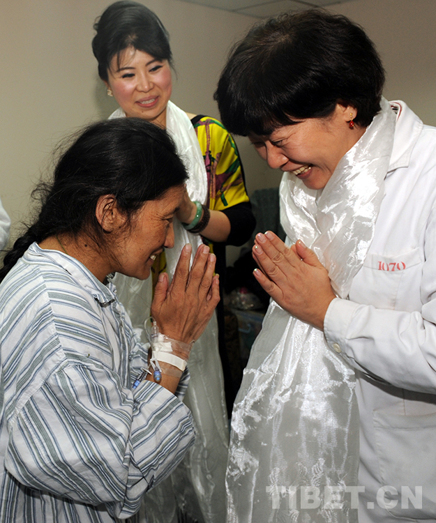 這是術(shù)后準備出院的藏族婦女才塔爾(前左)在北京安貞醫(yī)院向為自己做手術(shù)、幫著捐款的醫(yī)生顧虹敬獻哈達,并雙手合十致謝(唐召明2013年4月15日攝)