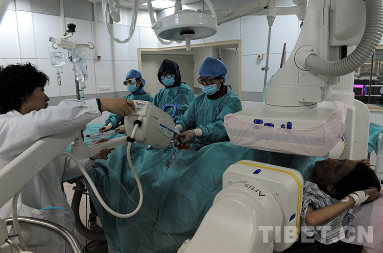 這是北京安貞醫(yī)院醫(yī)生顧虹(前右一)在北京安貞醫(yī)院為藏族婦女才塔爾實施心臟內(nèi)科介入手術(shù)(唐召明2013年4月2日攝)