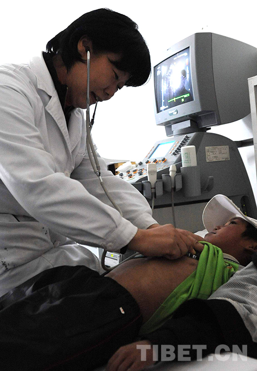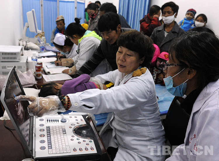 這是北京安貞醫(yī)院醫(yī)生顧虹在班戈縣人民醫(yī)院為當?shù)貎和M行先天性心臟病篩查(唐召明2015年10月8日攝)