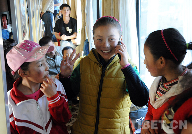 這是乘火車進京到北京安貞醫(yī)院進行先天性心臟病治療的患兒卓嘎,在火車將抵達北京時,給阿爸打電話報平安(唐召明2012年9月18日攝)