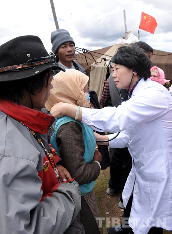 這是北京安貞醫(yī)院醫(yī)生顧虹在當雄縣納木錯鄉(xiāng)為牧民群眾進行先天性心臟病篩查(唐召明2012年7月29日攝)