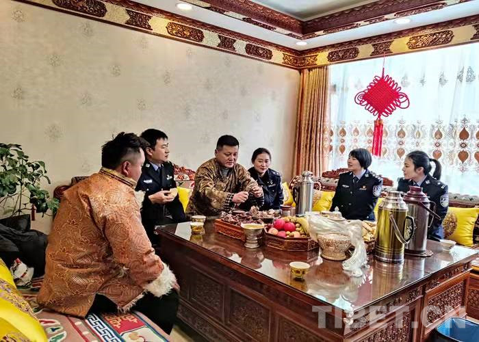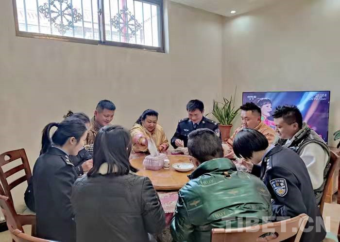 在藏歷水虎年到來之際,拉薩出入境邊防檢查站3名民警利用勤務間隙,帶著精心準備的節(jié)日慰問品前往結(jié)親民警尼瑪拉姆家中拜年。熱情好客的尼瑪拉姆一家用特色風干肉、煮牛肉、卡塞、時鮮水果等美食款待了前來結(jié)親的民警們。