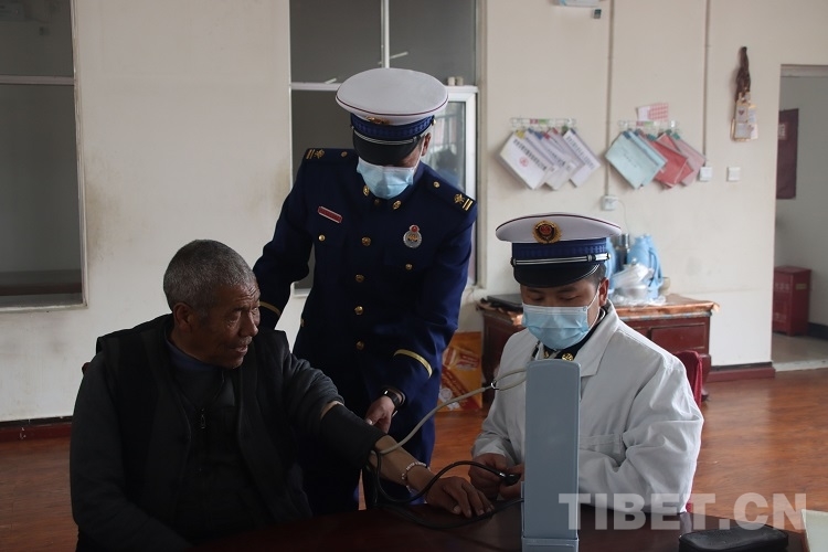 圖為林芝市森林消防支隊(duì)波密中隊(duì)隊(duì)員為福利院老人測量血壓