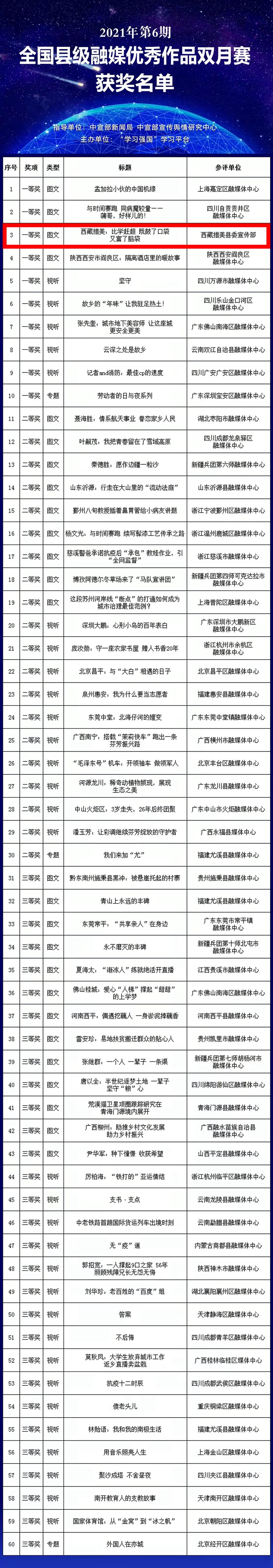 據(jù)了解,2021年第6期全國縣級融媒體中心優(yōu)秀作品雙月賽由中宣部新聞局、中宣部宣傳輿情研究中心指導(dǎo),“學(xué)習(xí)強(qiáng)國”學(xué)習(xí)平臺主辦,各省(區(qū)、市)和新疆生產(chǎn)建設(shè)兵團(tuán)學(xué)習(xí)平臺協(xié)助組織、共同實(shí)施,各省級學(xué)習(xí)平臺對投稿作品進(jìn)行初評,評選出299件優(yōu)秀作品,“學(xué)習(xí)強(qiáng)國”學(xué)習(xí)平臺組織專家評審團(tuán)隊對優(yōu)秀作品進(jìn)行復(fù)評、終評,最終評選出60件獲獎作品。