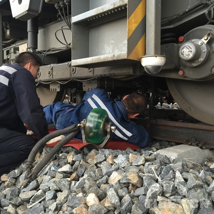 即將達(dá)到加查站時(shí),探傷員余賢明發(fā)現(xiàn)探傷車左側(cè)第2個(gè)探輪有破損現(xiàn)象,需要更換探輪,大家立刻按照分工各就各位。隊(duì)長(zhǎng)聯(lián)系集團(tuán)公司調(diào)度、加查站安排探傷車??寇囌?,設(shè)置好防護(hù)后,李生紅和余賢明立即鉆到車下拆卸破損探輪,崔成剛和李慧臣則準(zhǔn)備好新的探輪。四個(gè)人分工協(xié)作,在夜幕降臨之前將新的探輪安裝了上去。