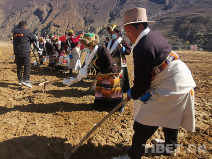 活動(dòng)現(xiàn)場(chǎng),群眾頭戴藏式金花帽,身著氆氌藏裝,或手持犁耙和鋤頭,或開著拖拉機(jī),以吃切瑪、敬青稞酒、獻(xiàn)哈達(dá)、跳鍋莊、犁地、播種等傳統(tǒng)習(xí)俗,隆重慶祝共康村首屆開耕節(jié)。