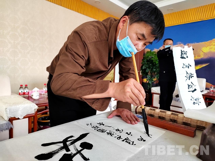 活動邀請的西藏自治區(qū)文聯(lián)3名書法家在現(xiàn)場潑墨揮毫。在場民警們紛紛在佳作前駐足欣賞,細(xì)細(xì)品味,感受到了筆墨之美,并與書法家們面對面交流,虛心求教。此外,西藏自治區(qū)文聯(lián)贈送四幅書法作品以示祝賀。