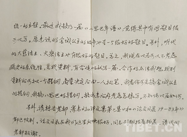 記得我大學(xué)畢業(yè)剛到新單位,人生地不熟,加之原來(lái)沉浸在“文學(xué)夢(mèng)”中,現(xiàn)在陡然轉(zhuǎn)到藏族歷史研究,所謂基礎(chǔ)不牢地動(dòng)山搖,困惑加不適,可想而知。陳老師在聊天中得知我的情況后,談到文史不分家,自己對(duì)文學(xué)也很有興趣,與青?!跺3薄肪庉嫼苁煜ぁ_@樣,我遇到一個(gè)學(xué)識(shí)淵博的良師益友,聆聽(tīng)指教,何其難得。在陳老師的鼓勵(lì)和幫助下,我在惶惑中嘗試把歷史與文學(xué)結(jié)合起來(lái),與他合作發(fā)表了歷史故事新編《長(zhǎng)安和親》《香波山奇遇—吐蕃聶墀贊普的故事》等,平穩(wěn)地完成了專業(yè)變動(dòng)的過(guò)渡期。后來(lái),他離開(kāi)中央民族學(xué)院到青海社會(huì)科學(xué)院工作,我們之間仍堅(jiān)持信件往來(lái),得到他很多幫助。每一次通信,我們談得最多的都是學(xué)術(shù)。在某次回信中,他談及下一步合作的工作,特別提到“至于今后如何搞,我想原來(lái)定的歷史故事新編計(jì)劃似乎是太大了一點(diǎn)。主要從藏族史的系統(tǒng)性考慮,而沒(méi)有考慮到現(xiàn)實(shí)的需要。所以我想還是先寫主題符合現(xiàn)實(shí)需要的題目,寫歌頌民族團(tuán)結(jié)、文化交流,國(guó)家統(tǒng)一的主題。最近,我搞了一篇《八思巴年譜》,覺(jué)得其中有些題目很可以寫。原來(lái)說(shuō)的金城公主的故事也是一個(gè)很好的題目。另外,明代的大慈法王、大乘法王也有很好的題目??傊椰F(xiàn)在認(rèn)為可以不考慮藏族史的系統(tǒng)性,先找資料,有合適的就寫一篇。合作的辦法我想找到資料后,可擬一個(gè)提綱,商量決定后,由一人執(zhí)筆。我看你可先搞金城公主的提綱,我搞八思巴的提綱,搞出來(lái)后再考慮怎樣寫,不知你以為如何?!?/p>