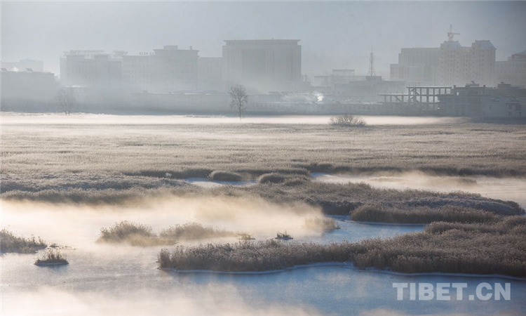日出時分拉魯濕地升騰起的薄霧。攝影:趙耀