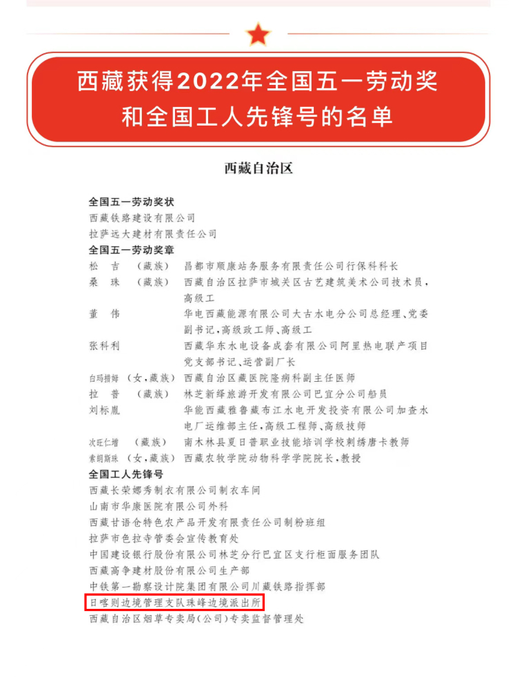 中國西藏網(wǎng)訊 2022年4月28日,中華全國總工會發(fā)布2022年全國五一勞動獎和全國工人先鋒號表彰人選(集體)名單,西藏出入境邊防檢查總站日喀則邊境管理支隊珠峰邊境派出所獲“全國工人先鋒號”稱號。