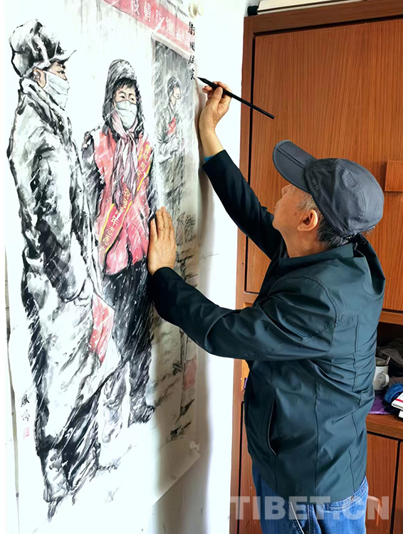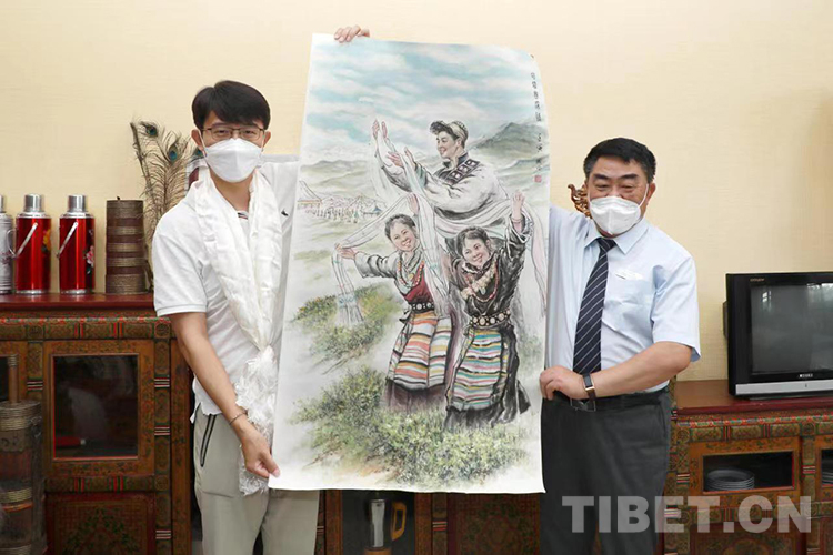 “我愛人看到了咱們館(西藏文化博物館)發(fā)的征稿啟事,然后就把這條信息發(fā)到家庭群里邊。過了不久,我父親說他畫了一張畫,讓我看看畫得怎么樣。我當(dāng)時(shí)還很意外,本來想鼓勵(lì)我兒子畫一張,結(jié)果我兒子沒畫,老爺子畫得還很好。”6月21日,張兆林先生將自己的作品《哈達(dá)寄深情》捐贈(zèng)給西藏文化博物館,張兆林之子張安誠將作品送至博物館并收到了捐贈(zèng)證書。