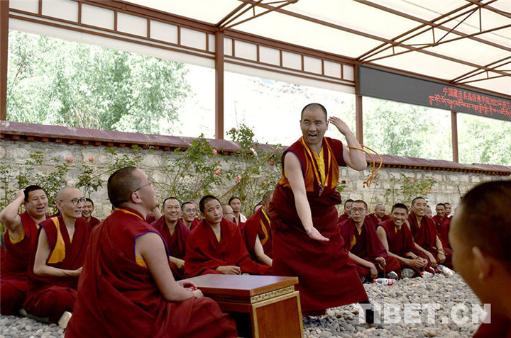 圖為中國藏語系高級佛學院2022級“拓然巴”高級學銜班招生考試西藏考點現(xiàn)場,考僧正在互辯。攝影:王媛媛