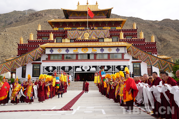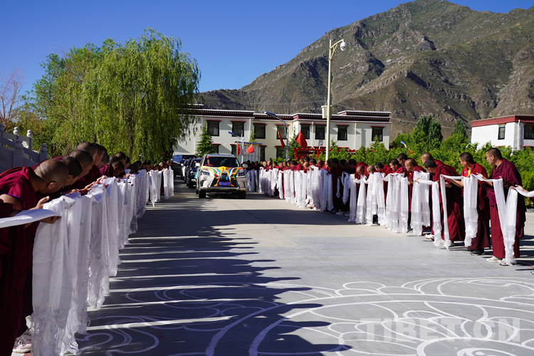 圖為班禪抵達西藏佛學院并向僧眾致意 攝影:王淑