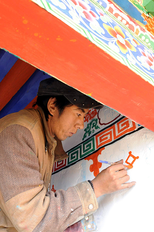 這是尼瑪縣文部鄉(xiāng)南村一戶人家請來畫師為自家安居新房進行室內彩繪(唐召明2009年攝)