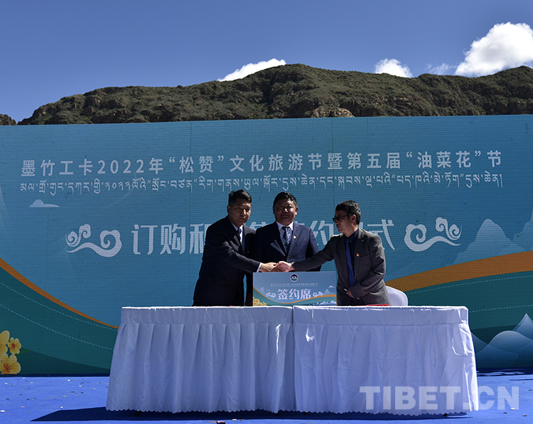 圖為墨竹工卡縣松贊文化旅游節(jié)暨第五屆油菜花節(jié)開幕式上,墨竹工卡縣農(nóng)牧業(yè)凈土產(chǎn)業(yè)發(fā)展有限公司代表與唐加鄉(xiāng)、扎西崗鄉(xiāng)分別簽訂認(rèn)購、預(yù)售合同 攝影:王媛媛