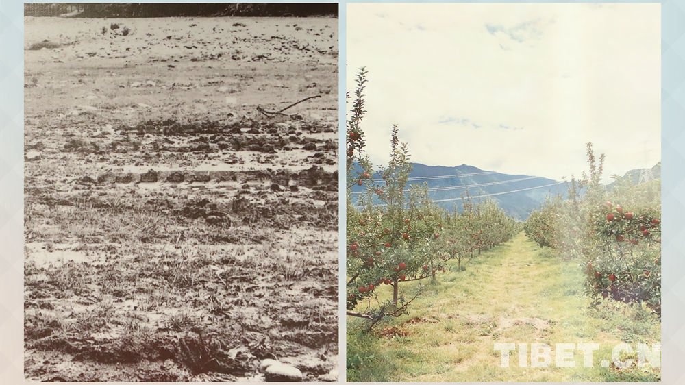 左圖,過去嘎拉村采摘園改造前的荒地;右圖,現(xiàn)在嘎拉村實(shí)施觀光采摘園項(xiàng)目。 孔夏翻拍自嘎拉村紅色研學(xué)主題教育展覽館
