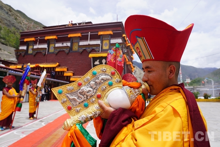 10時許,班禪抵達扎果寺。頓時,法號長鳴,鼓樂喧天,第六世德珠?加央西繞班旦活佛及僧眾以最隆重的宗教禮儀歡迎班禪的到來。