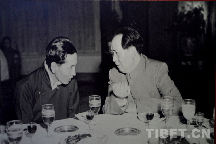 圖為1951年5月24日,毛澤東主席設(shè)宴慶?!吨醒肴嗣裾臀鞑氐胤秸P(guān)于和平解放西藏辦法的協(xié)議》的簽訂。宴會上,毛主席與阿沛?阿旺晉美(左)親切交談